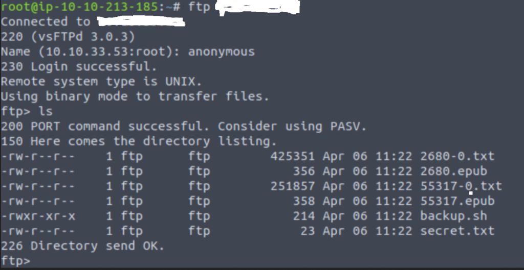 Now with these services found running on the target system, we can try to login to the ftp server anonymously. If anonymous login is enabled, then we can further explore to find our footings in the system and find valuable file to get shell access to the system.